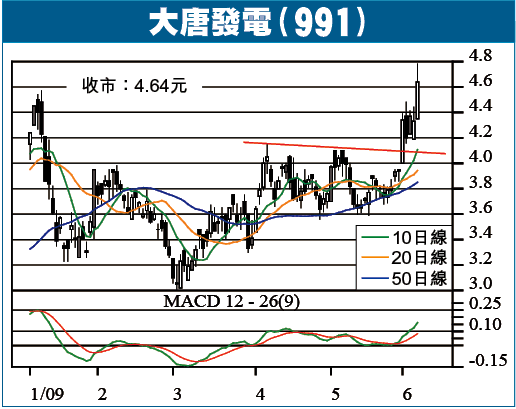 大唐發電(991)昨收4.64元,升7.1%。股價早前突破250日線及保歷加通道頂,隨後在高位橫行整固,成交縮減,昨天成交顯著回升,支持股價突破橫行區炒上,9RSI及MACD強勢,短線料可上試5.30元阻力,破位看6元。昨天電力股全面炒上,相信大唐升浪只屬起步,潛在升幅吸引。