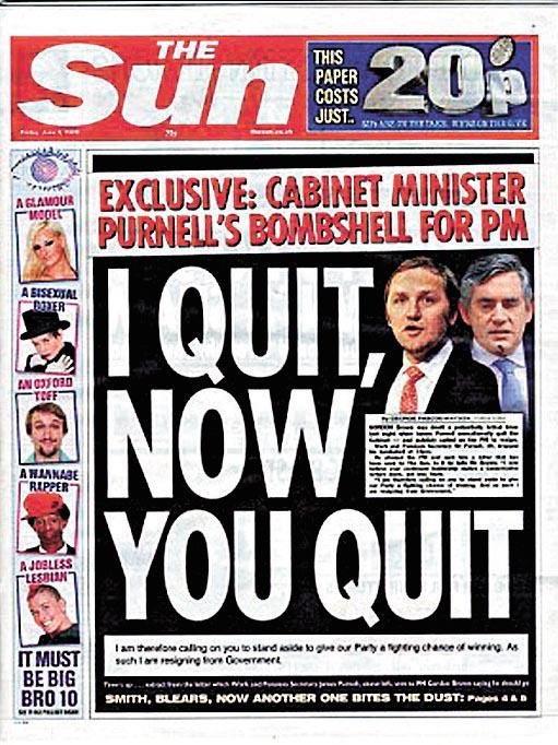 「我辭職,請你也下台。」相位岌岌可危的英國首相白高敦(GordonBrown),在公佈內閣改組前,被視為執政工黨明日之星的就業及退休保障大臣貝禮高(JamesPurnell)前晚(周四)突然宣佈辭職,並要求白高敦以工黨前途為重下台,加上後座議員聯署逼宮行動幾近湊夠票之際,貝禮高請辭猶如在白高敦背後狠插一刀,令白高敦隨時步前首相戴卓爾夫人後塵,在黨內宮廷政變中黯然下台。