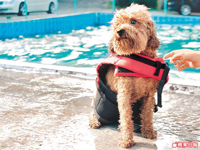 「左左起初不願下水,幸好有救生衣,而且是泳池,我可不敢帶牠到沙灘游水。」