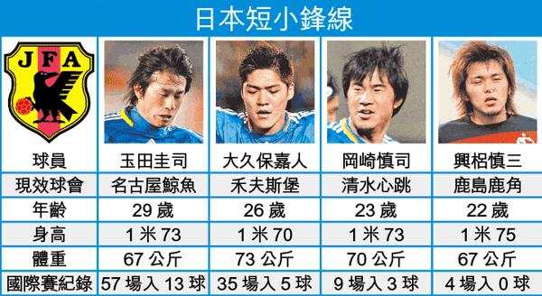 日本5名前鋒之中,僅得於12場國際賽入一球的矢野貴章屬高佬,身高有1米85;其餘4人都屬矮仔,其中大久保嘉人的身高更只有1米70。