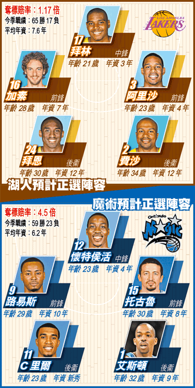 湖人正選陣容年資比魔術多1.4年(見球場圖),除了阿里沙及拜林上季因傷缺陣外,其他主力均有總決賽經驗,費沙、拜恩等多次總冠軍功臣更不用多說。34歲的費沙在之前的系列賽一直飽受批評,指速度跟不上比立斯,但他亦提出自己的優異:「在總決賽,每一個決定都十分重要,這是經驗累積得來。」文:牽牛