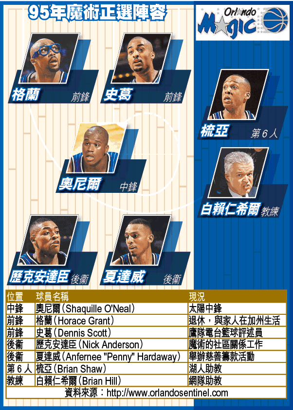魔術在95年球季,獲得曾協助公牛3奪總冠軍的大前鋒格蘭加盟,與奧尼爾組成當時聯盟最強的「內線2人組」,配合隊中的3分射手歷克安達臣、史葛、梳亞及「佐敦接班人」夏達威,使魔術當季締造東岸最佳戰績57勝25負,成為聯盟冒升速度最快的球隊。