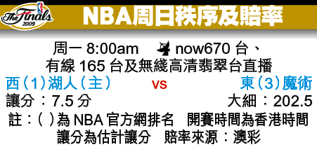 NBA總決賽第2場今早於洛杉磯的史達普斯球場展開,湖人乘首仗大勝25分的氣勢,能否再下一城,放離魔術?(now670台、有線165台及無綫高清翡翠台今日8:00am直播)