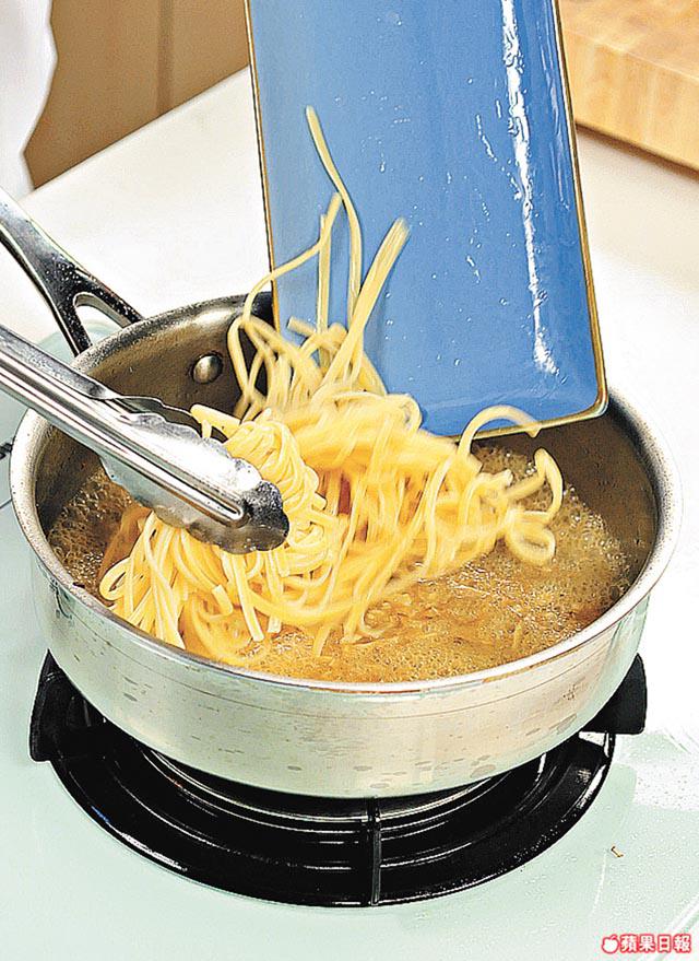 1.煲滾水下鹽,放入扁意粉烚9分鐘,大概煮至七成熟撈起備用。
