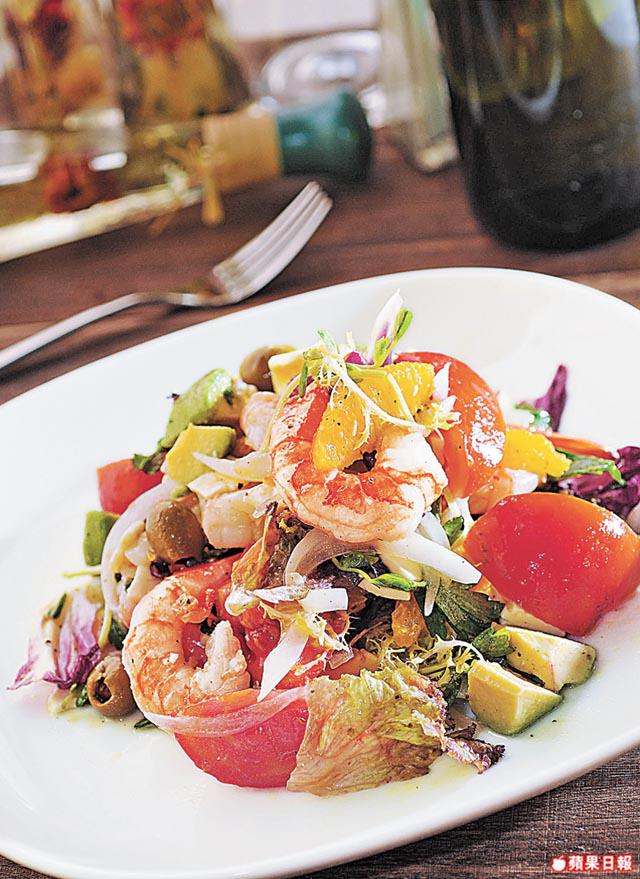 熟蝦肉8隻、車打芝士/橄欖各30克、牛油果(切粒)20克、橄欖油20毫升、青檸汁11/2個、橙肉/番茄各40克(切角)、洋葱(切絲)20克、雜菜15克、幼鹽/黑胡椒各少許