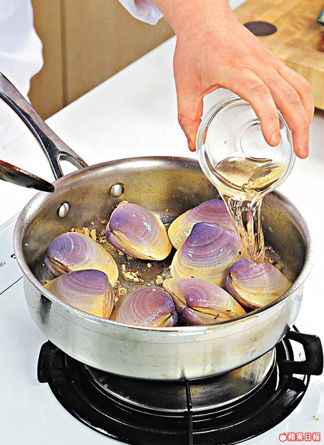 2.燒熱鑊下橄欖油,爆香乾葱、蒜頭,下貴妃蚌略炒,注入白酒和雞湯,冚蓋煮3分鐘。