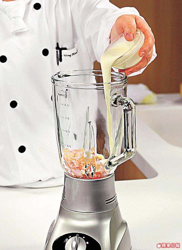 3.將湯料倒入攪拌機中打碎,倒回煲開中火再煮熱,下忌廉拌勻,再下鹽和黑胡椒拌勻,倒入湯碗中備用。