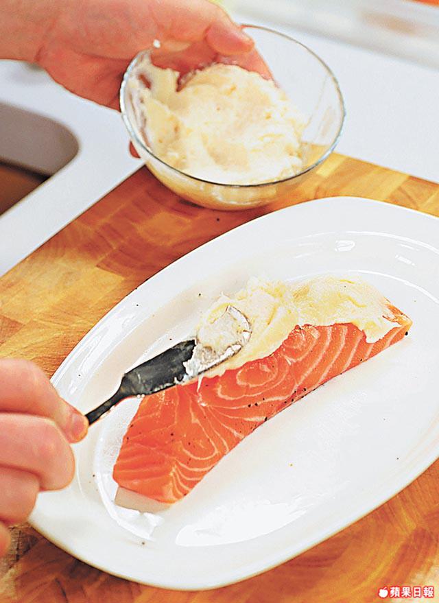 2.將三文魚兩面撒上鹽和黑胡椒,然後於三文魚面塗上一層龍脷慕絲。