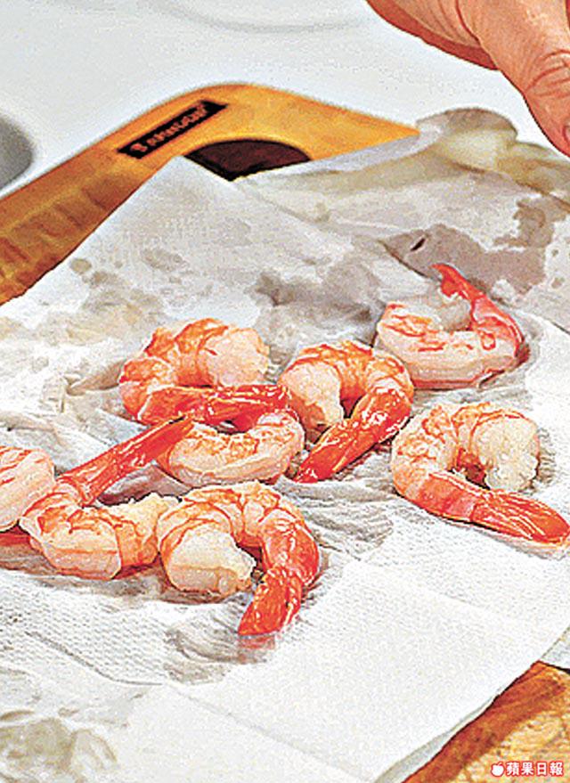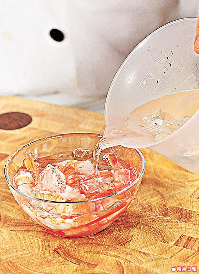 1.先將蝦放入熱水中浸5分鐘去除雪氣味,再放入冰水過冷河,取出用廚紙吸乾水備用。