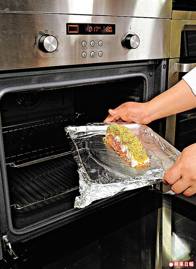 4.預熱焗爐至180℃,放入三文魚柳,焗約18分鐘至表面金黃香脆取出上碟。