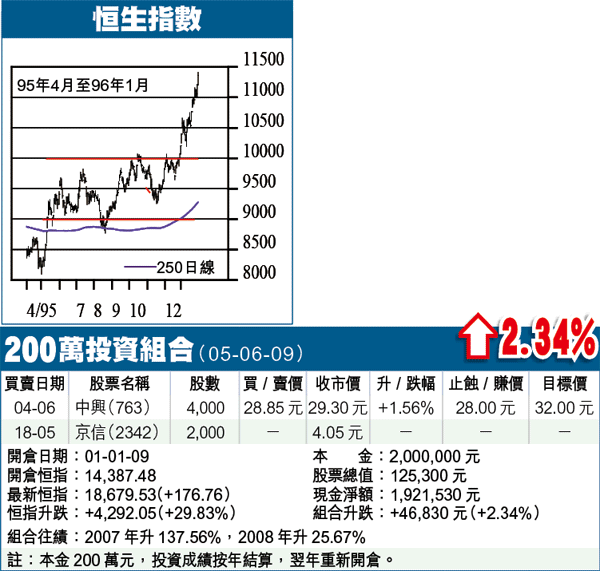 95年5月恒指升破250日線後,在大約1000點的範圍內橫行近8個月才突破,其間曾有一次稍為跌破250日線(見圖)。98年那次,恒指橫行了5個半月才突破,其間曾有一次跌破250日線並徘徊多日。