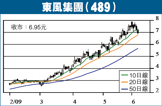 過去3個月,東風累積升幅178%,高位是7.89元,與07年高位接近,趁勢調整,成交亦已下跌。現價6.95元,往績PE13倍,息率0.7%,是相當低的息率,是其缺點,優點是財政佳,具自主品牌發展概念,預期今年PE在12倍以下,息率變化不大。