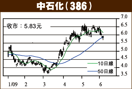 中石化(386)在上周加完成品油價後,股價連跌多日,為三大石油石化股中表現最差。若本週有反彈的話,宜趁高沽售。