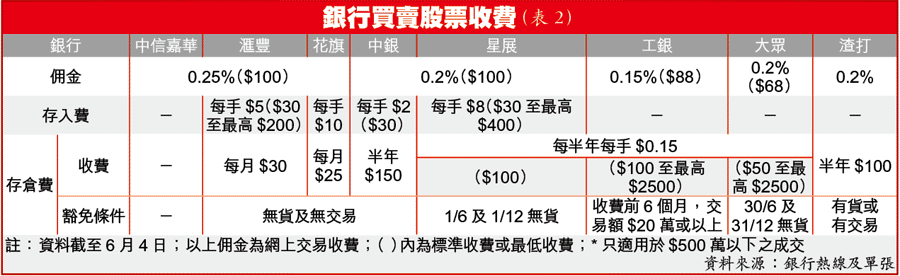 開戶優惠固然吸引,但只屬短期「甜頭」,投資最緊要計成本,當中主要留意佣金、託管費及存入證券費,理財版格盡所有銀行,以買入1手及10手滙豐計,細額交易以渣打成本最低,因不設最低佣金收費,單計成交額0.2%,1手只需約54元,為眾銀行收費最低(表2)。