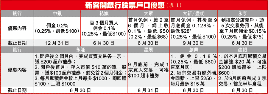 大新及豐明除首月網上交易免佣,其後至9月底,每次交易收0.128%,最低28元,較標準收費0.25%或最少收100元,便宜72元。創興以佣金回贈吸客,只要本月底成功開股票賬戶,並透過網上交易平台「創興網」交易,每次買盤將有特別回贈,計算方法是:網上買盤佣金減28元,優惠期內佣金劃一收0.18%。