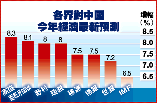 市場預測中國今年經濟表現的差異正逐步收窄,由首季約3%至8%相差近5個百分點,收窄至目前6.5%至8.3%,差距只有少於2個百分點,市場一般預期在7.5%水平左右。當中以高盛預測最樂觀,達8.3%;而國際貨幣基金組織較悲觀,增幅為6.5%。