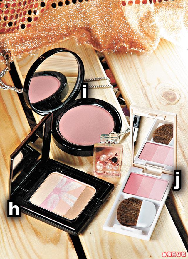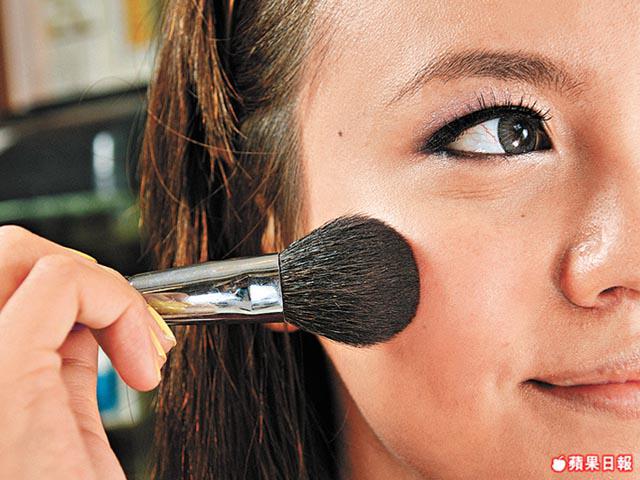 眼妝成為整個妝的焦點後,胭脂及唇妝都要以淡為主,令整個妝得以平衡,絕不能一濃到底,胭脂可用淺粉紅色胭脂,Ava提醒,如果想面色更為紅潤,可用ShimmerPowder,掃在髮邊及鼻位等,另外亦可用光影粉,令整個輪廓更為突出,用淺色光影粉輕手在鼻樑及眼下掃少少,記得不要太重手在同一地方掃太多。唇妝可選用淺粉紅色唇彩,內含閃粉,偏蝦肉色唇彩塑造Nude嘴妝。