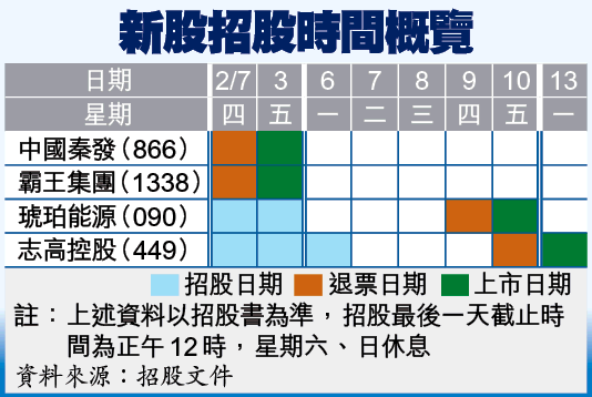 根據公開發售超購倍數,霸王及秦發分別自國際配售回撥2.8億股及7500萬股作公開發售,令公開發售股份提高至3.5億股及1億股。