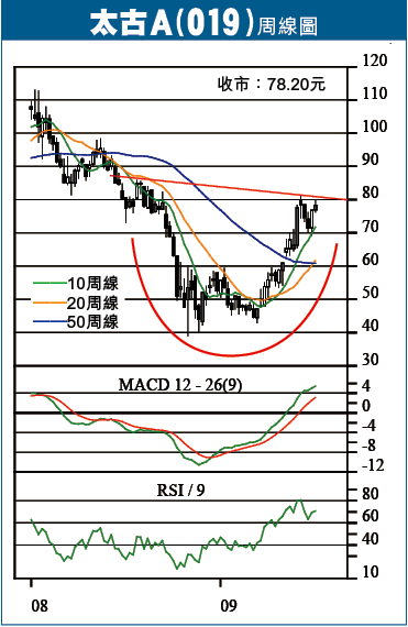 右圖為太古A(019)周線圖,自去年9月至今形成相當明顯的圓底收集形態,近日升抵80元初現阻力,有機會在70至80元水平造柄,整固後料再展升途。太A的10周線早於4月已升穿20周線,5月再升穿50周線,至本周20周線再升穿50周線,形成全面向上排列,若股價回至70元附近,買貨莫遲疑。