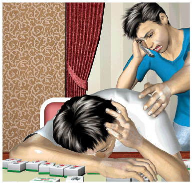 【本報訊】一名中年漢昨凌晨在旺角一間酒家與友人攻打四方城,正大殺三方叫清一色萬子「三飛」之際,卻被上家自摸「卡窿」三萬一番「食糊」,令他這鋪牌由贏變輸,來回損失3,600元,事主當場氣頂至頭暈肚痛,面青唇白及全身標冷汗,雀友見狀恐他生命有危險報警求助。事主一度登上救護車稍事休息,未幾便「彈起身」精神奕奕自行落車,與雀友返回酒家繼續竹戰。