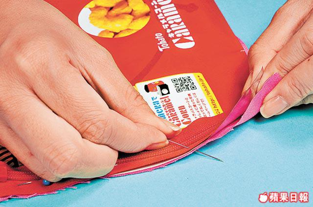 2.把布放薯片袋底;拉鏈面則放薯片袋面右側,以大頭針固定後用針線縫合。重複另一邊;把袋反轉。