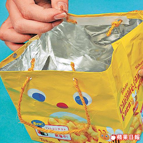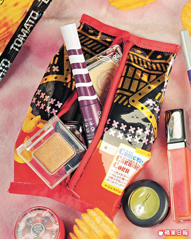 把薯片袋變成化妝袋,是否有點匪夷所思?要做化妝袋或雜物袋可選擇一些帶厚度的包裝,這樣便能盡顯圖案,而且包裝袋具防污防水之效,殘了又可換另一個期間限定,每季轉款都得。