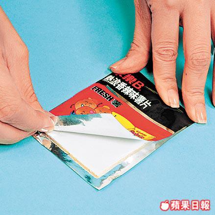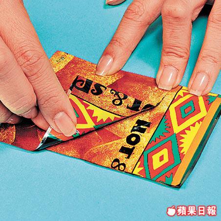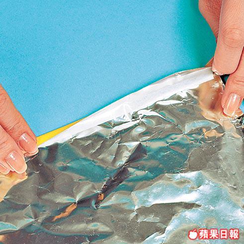 1. 把薯片袋剪出兩塊10×7cm的長方形,把卡紙置於其中,以雙面膠紙貼合,變成卡片。