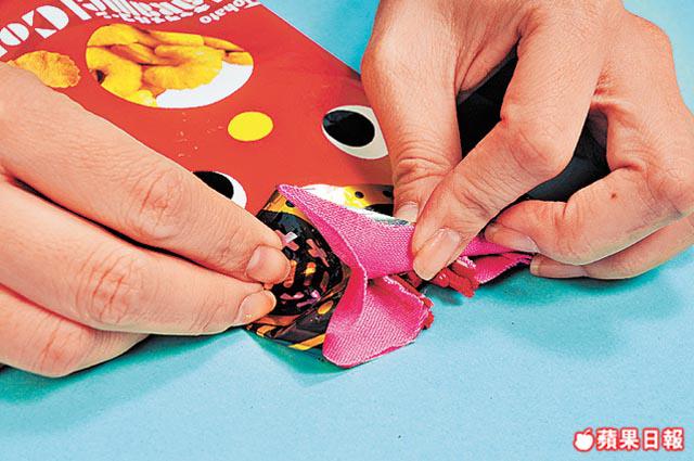3. 在薯片袋剪出3條1×12cm的幼條,把幼條頭和尾以針線縫成一條後,把長條圍邊包着(2)縫合好。