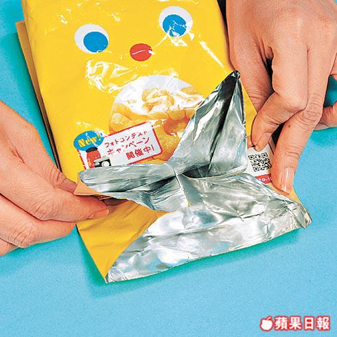1.把薯片袋的上端約1cm的邊位,向內摺並以雙面膠紙黏合。