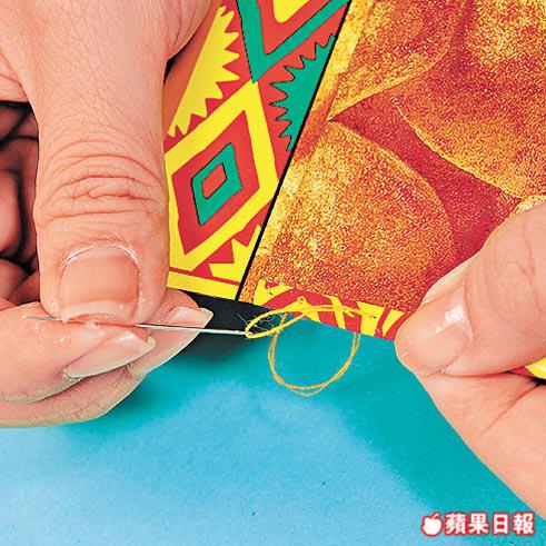 4.把兩條10cm長的布帶分別包着袋的上下開口位,以針線縫好後再用白膠漿封邊口,以免紕口。