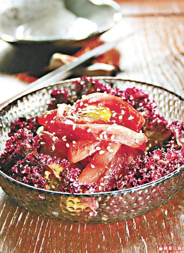 吞拿魚切成條狀,用上韓式甜汁撈過,味道鮮甜。