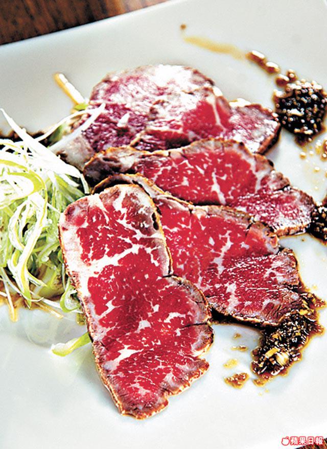 牛肉半煎熟後切成薄片,外脆內軟,有肉汁。
