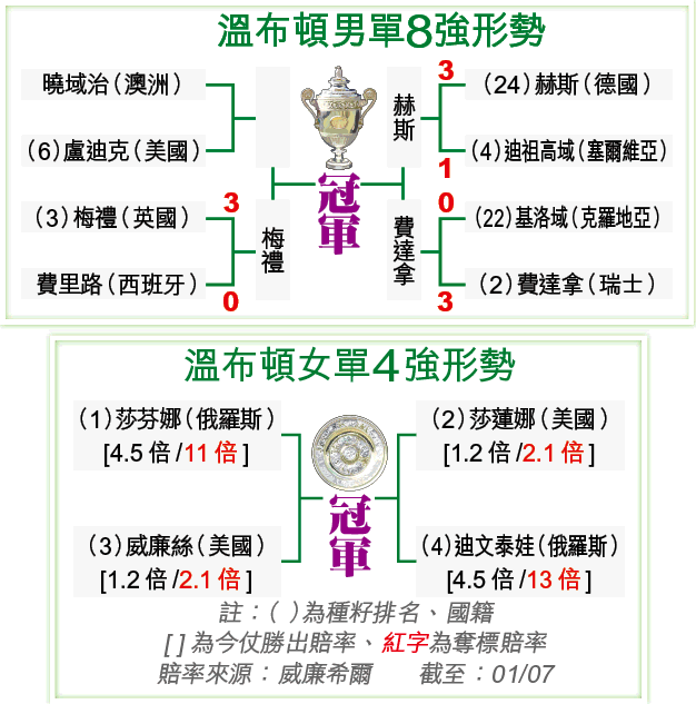 力爭第15個大滿貫的瑞士球手費達拿,周三在溫布頓網賽男單8強,僅花1小時43分鐘,便以總盤數3:0淘汰克羅地亞「長人」基洛域,連續6年殺入溫布頓男單4強;準決賽將與爆冷淘汰迪祖高域的德國球手赫斯碰頭。