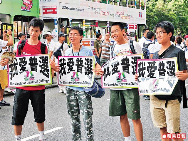 由八十年代開始爭取八八直選,到回歸後每年參加7.1遊行,普選夢一年又一年落空,「家都爭取唔到梗係失望同心痛啦,年年都嚟行,最好2012有啦,慢慢行都唔辛苦。」跟她同行的兒子補充,「伊朗都有(選舉),香港都未有。」除了兒子外,近年民主路上多了年輕人同行,令她很鼓舞,「希望政府可以聽到人民嘅聲音,唔係老闆叫你做乜你就做乜。」