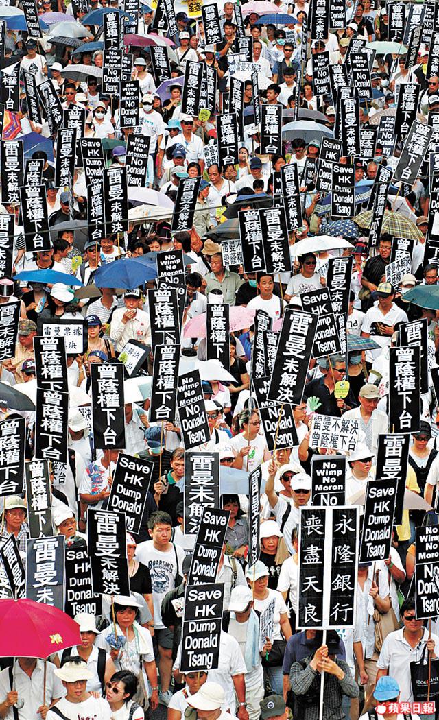 【本報訊】「雷曼未解決,曾蔭權下台!」雷曼爆煲近十個月,但大部份苦主仍未獲賠償。雷曼苦主大聯盟趁昨日7.1發起2.5萬人大遊行,矛頭直指行政長官曾蔭權,沿途幾乎只高叫「曾蔭權下台」的口號;部份人士遊行至金鐘中銀大廈時,更一度推撞中銀門外的鐵馬,試圖衝入中銀大廈,與警方對峙超過20分鐘。大聯盟警告,若政府及銀行仍漠視聯盟訴求,十月一日國慶會發動苦主包圍中銀。