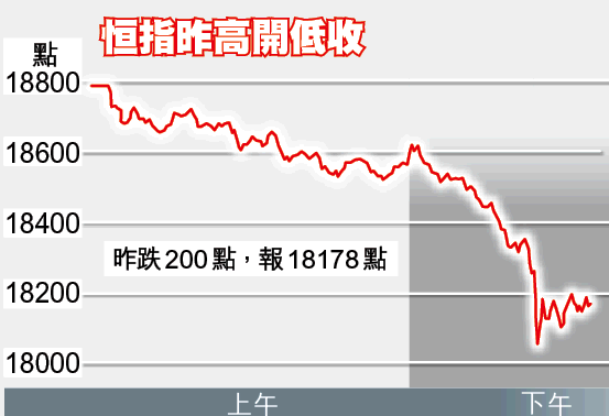【本報訊】港股昨承接A股強勢高開400點,衝上18780點,惟大戶托住重磅股「陰乾式」派貨,散戶午後遂群起沽貨套現,恒指終倒跌200點(1.09%),收18178點。業界指出,觀乎沽空成交、技術走勢及外圍形勢,皆對港股不利,大市已醞釀轉勢下跌。