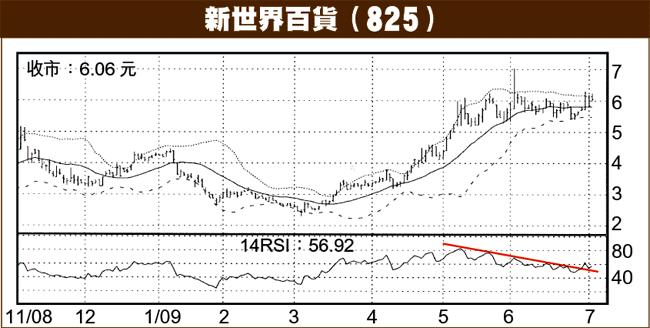 昨日港股在午後下挫時,筆者察覺新世界百貨(825)頗為強硬,仍能逆市上升,企穩6元之上,同時近日其14天RSI亦已升破下降軌,相信升勢未止。唯一問題是其保歷加通道(20,2SD)頂暫處6.135元,假若沒有其他特殊利好因素,可能不容易一舉衝破這通道頂阻力。幸好近日其店舖銷售動力回升,最終應可助其股價破關,暫以6月1日高位7.04元為短期目標。