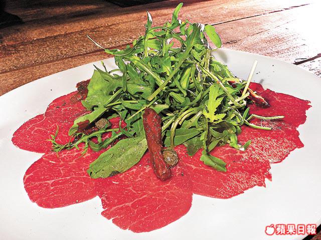 美國穀飼牛肉片軟滑、牛味濃,配水瓜柳、火箭菜及松露油,香氣十足。