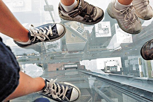 美國芝加哥地標大廈西爾斯塔,在第103層樓層建造了多個懸吊半空的玻璃露台,昨天正式開放,讓大膽的民眾踏上只有3.75厘米厚的玻璃面上,飽覽全市景色之餘,還可俯瞰離地410米的街景。不少人都說在露台踏出第一步是最困難,心臟狂跳,擔心會否跌下去。美國《今日美國報》