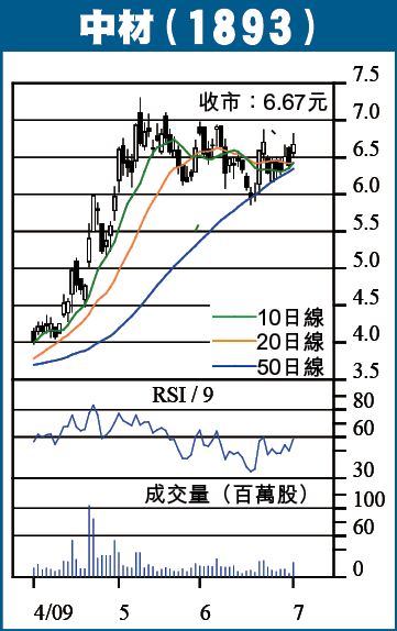 中材股份(1893)昨收6.67元,升4.3%。股價在過去兩周在50日線水平整固,未有明顯跌穿,近日技術走勢漸見改善。