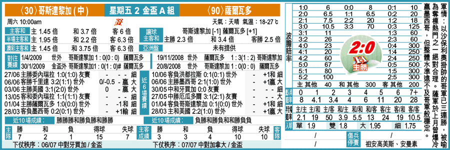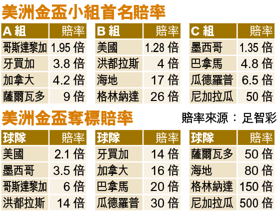 簡評:美洲金盃於1963年首次舉辦,今年為第20屆。歷來奪冠次數最多為墨西哥,共7次,其次為美國(4次);至於對上4屆的美洲金盃,美國奪得02、05及07年的冠軍,03年則以季軍完成賽事,今年以衞冕身份出戰;由於主辦國關係,美國以2.1倍成奪標大熱。