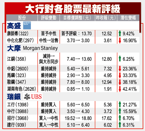 大摩指,由於環球銅庫存及供應下降,故將今明兩年銅價預測大幅調高五成,並上調江銅每股盈利預測至65分及80分人民幣,評級亦由「減持」調高至「與大市同步」,目標價上調至13.6元,仍具6.3%升值潛力。不過,該行將明年鋁價調低6%,故預期中鋁股價將跌至5.61元。大摩雖將鋼價預測上調,並調高馬鋼及鞍鋼目標價,但新目標價仍較昨收市價低33%及38%。