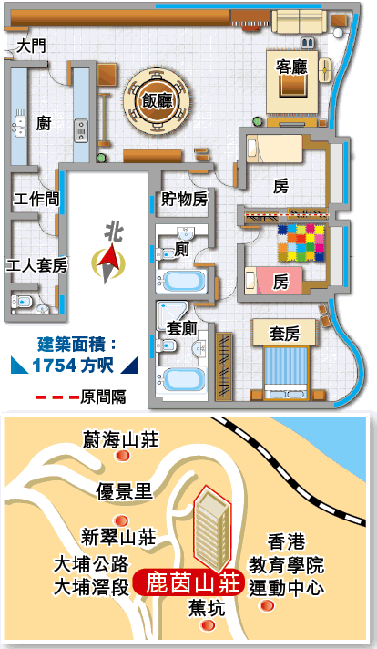 鹿茵山莊1至6座為高座住宅,介紹屬於單邊第6座高層單位,景觀更廣闊。甫踏入玄關,已可從客廳落地屏幕大窗,透視外間山海景色;步近窗前,可俯瞰前方山坡林木及香港教育學院運動場,以至對開吐露港及遠山景色。雖然臨海地皮在發展中,但興建低密度住宅,估計對日後海景影響輕微。
