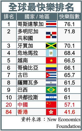【本報訊】是香港人生活要求高?還是大陸人太過安於現狀?倫敦志願機構NewEconomicsFoundation調查指出,中國人快樂指數排名20,香港人則排第84。調查中排名前列的都不是富庶的國家,犯罪率甚高的哥倫比亞與巴西等國,都打入十大快樂國家。