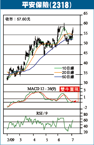 內地A股強勁,本港上市3隻內地保險股應最受惠,平保(2318)連升3個交易日,昨已逼近上月初高位60元水平,MACD重現雙牛,技術走勢很大機會破頂。假如平保升穿60元,將升穿去年7月及8月兩個反彈高位,是一個明確向上突破訊號。假設平保破關,大市調整幅度應有限,欲趁大市跌落50日至250日線中長線建倉者,宜留意平保去向。