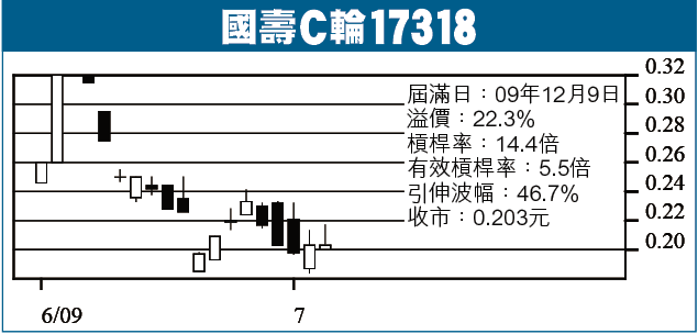■國壽C輪17318收0.203元,無升跌,成交521球。此輪09年12月9日到期,行使價33.68元,溢價22.3%,槓桿率14.4倍,有效5.5倍,引伸波幅46.7%。正股見32元,此輪理論價0.324元,升60%。