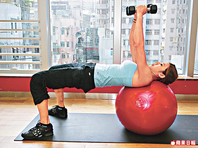 仰卧飛鳥:躺在健康球上,手握約兩磅的啞鈴,雙手向外打開,然後向上舉起(重複做3組,每組20次)