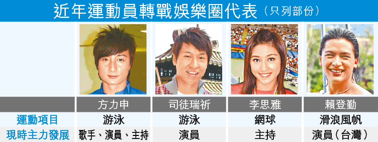 簡評:香港運動員轉戰娛樂圈並非新鮮事,數近年加入娛樂圈的最成功例子,應屬「飛魚王子」方力申;前網球女將李思雅亦透過選美加入娛樂圈,現時多出任體育節目主持人。另外前滑浪風帆好手、「風之后」李麗珊表弟賴登勤,改了藝名周群達,主攻台灣拍劇。(只列部份)