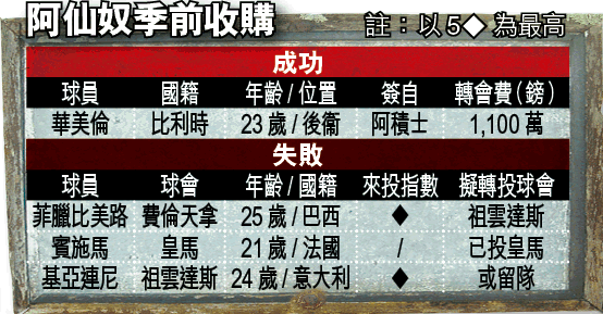 事實上,阿仙奴於轉會市場頻頻碰釘,由最初欲簽下祖雲達斯中堅基亞尼連,到領隊雲格打「友情牌」,與曼聯及皇家馬德里等競逐里昂前鋒賓施馬,惜該名21歲法國國腳最後選擇了皇馬。到目前為止,兵工廠僅從阿積士購得比利時守將華美倫。