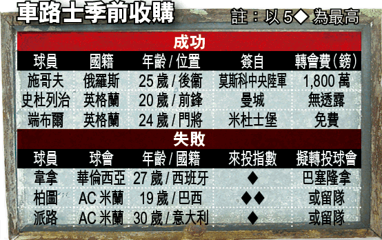 在買賣球員方面,車路士之前引入的史杜列治與端布爾,顯然都不入流;直到周二完成以1,800萬鎊羅致施哥夫,才算完成一個重要收購。該俄羅斯國腳與藍戰士簽約3年後說:「任何足球員都樂於與車路士簽約。」施哥夫的說法未免太主觀,至少之前幾個車仔「獵物」,都沒抱相同態度。